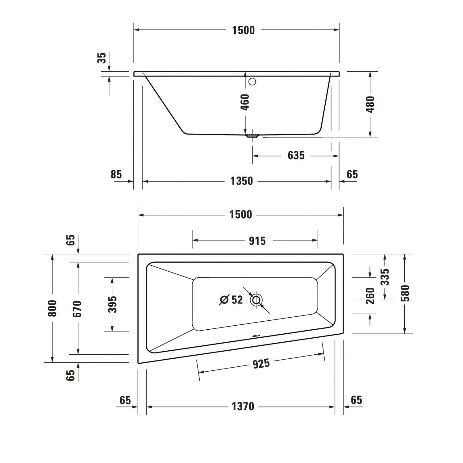 Duravit No. 1 Trapez-Badewanne 150 x 80 cm mit 1 Rückenschräge links