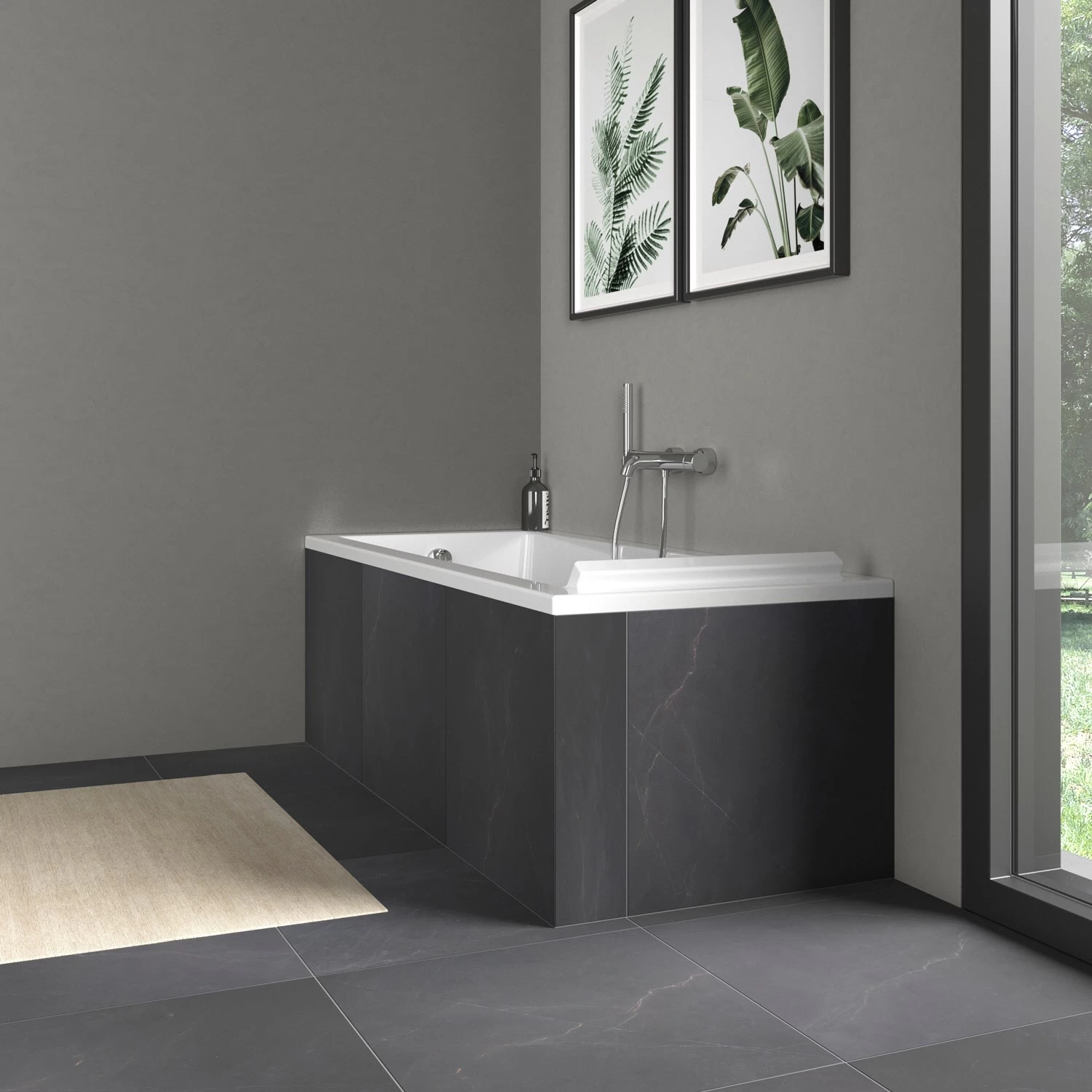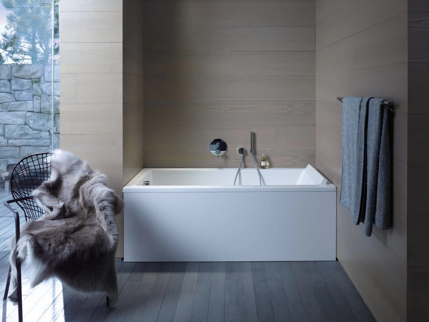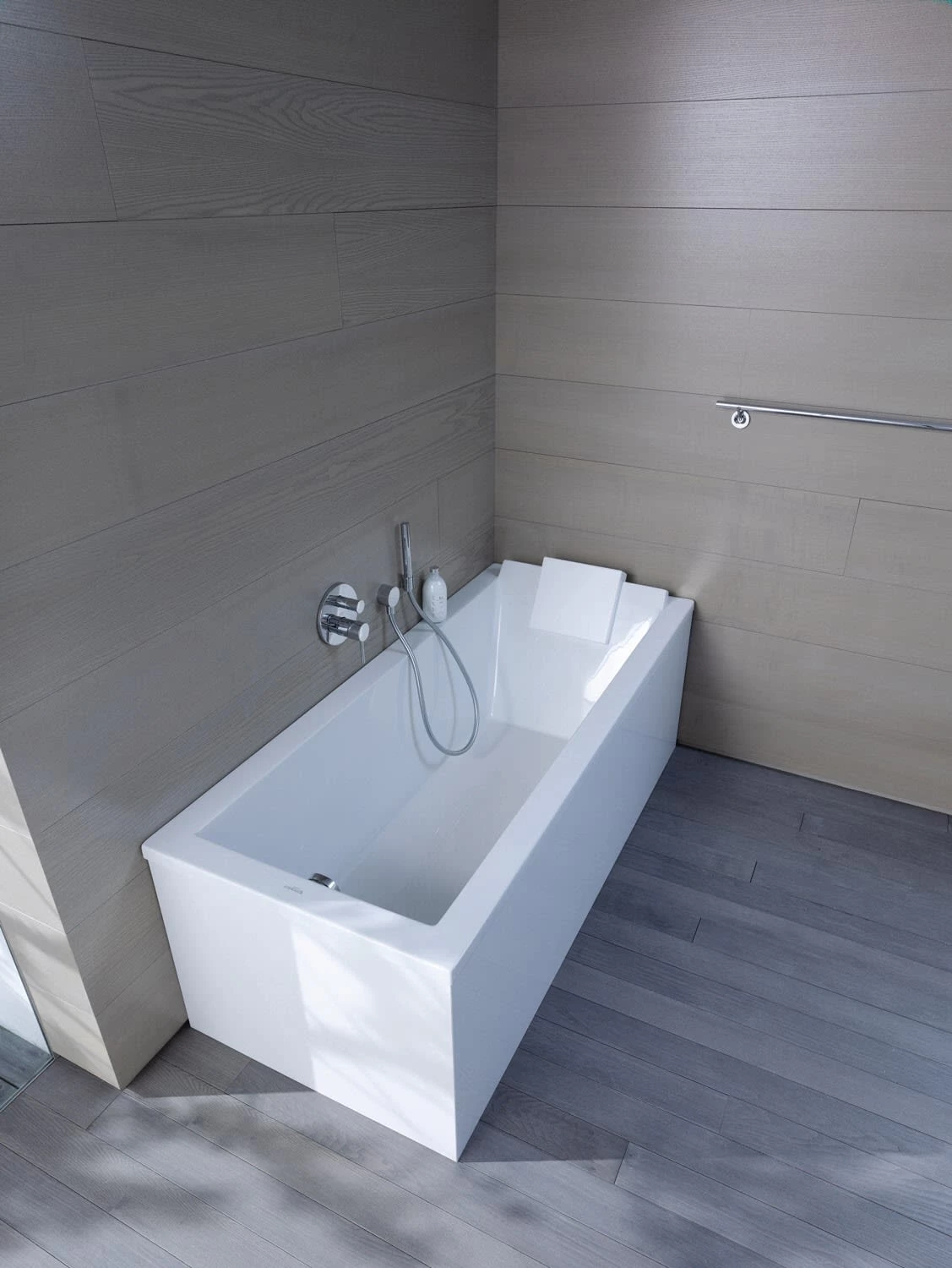 Geradliniger Blickfang und stilvolle Entspannung: die wohlproportionierte Duravit Starck Rechteck-Badewanne macht beides möglich! Die klassisch moderne Badewanne von Philippe Starck umschließt eine elegant-kantige Kontur den großzügig gestalteten, eckigen Innenraum. Eine gemütliche Rückenschräge mit angeformter Nackenstütze bildet die perfekte Ablage für Ihren Kopf und ermöglicht in Verbindung mit dem im Fußbereich angeordneten Ab- und Überlauf bequemen Sitz- und Liegekomfort. Ergänzend kann das Wohlfühlerlebnis mit dem optional erhältlichen Duravit Starck Nackenkissen gelungen abgerundet werden. Dank des schlag- und stoßunempfindlichen Sanitäracryls mit seiner glatten, porenfreien Oberfläche stellt sich beim Baden zudem ein angenehm warmes Hautgefühl ein. Die Badewanne kann wahlweise als Einbauversion verfliest oder mit einer passenden Wannenverkleidung aus weißem Acryl kombiniert werden, für maximalen Gestaltungsfreiraum.