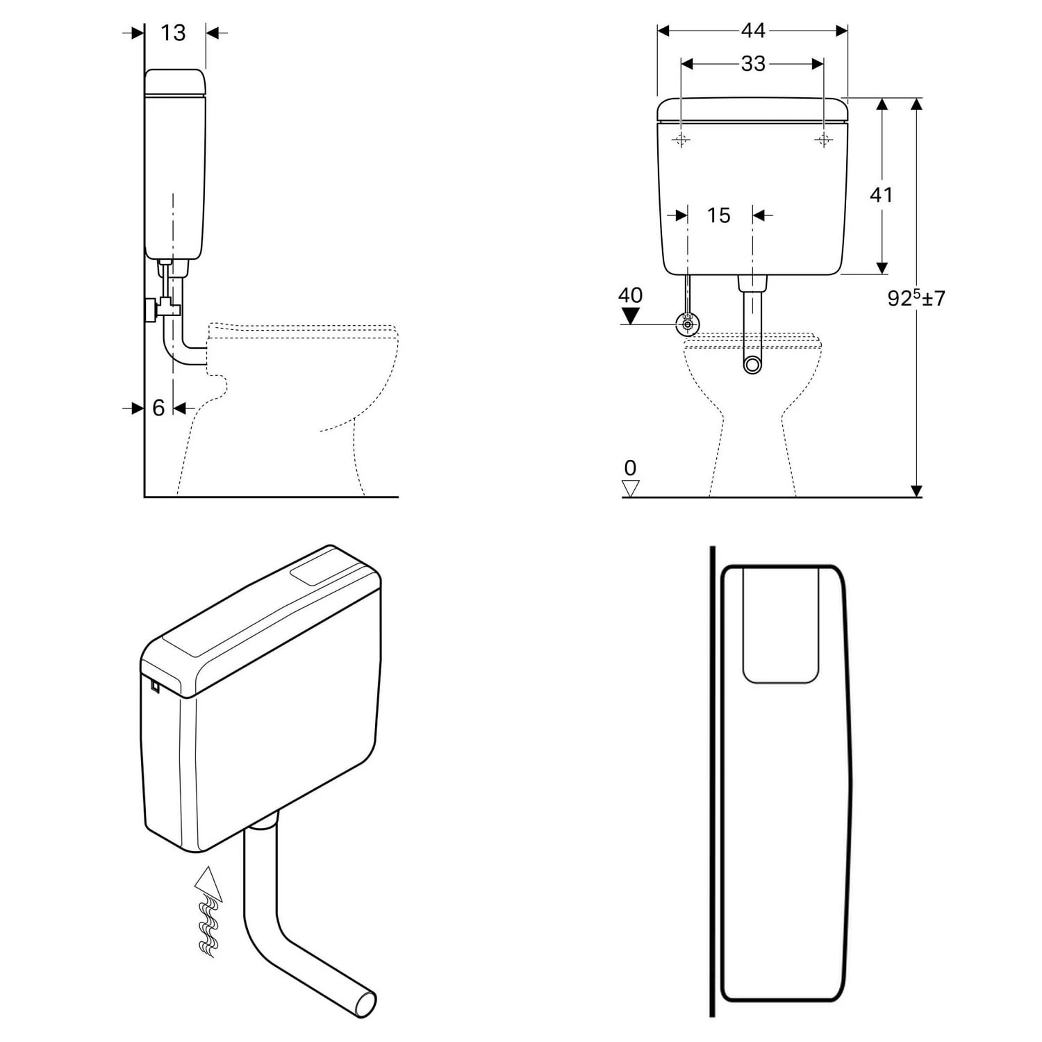 Geberit AP-Spülkasten AP127 tiefhängend mit Spül-Stopp-Spülung, Anschluss unten links
