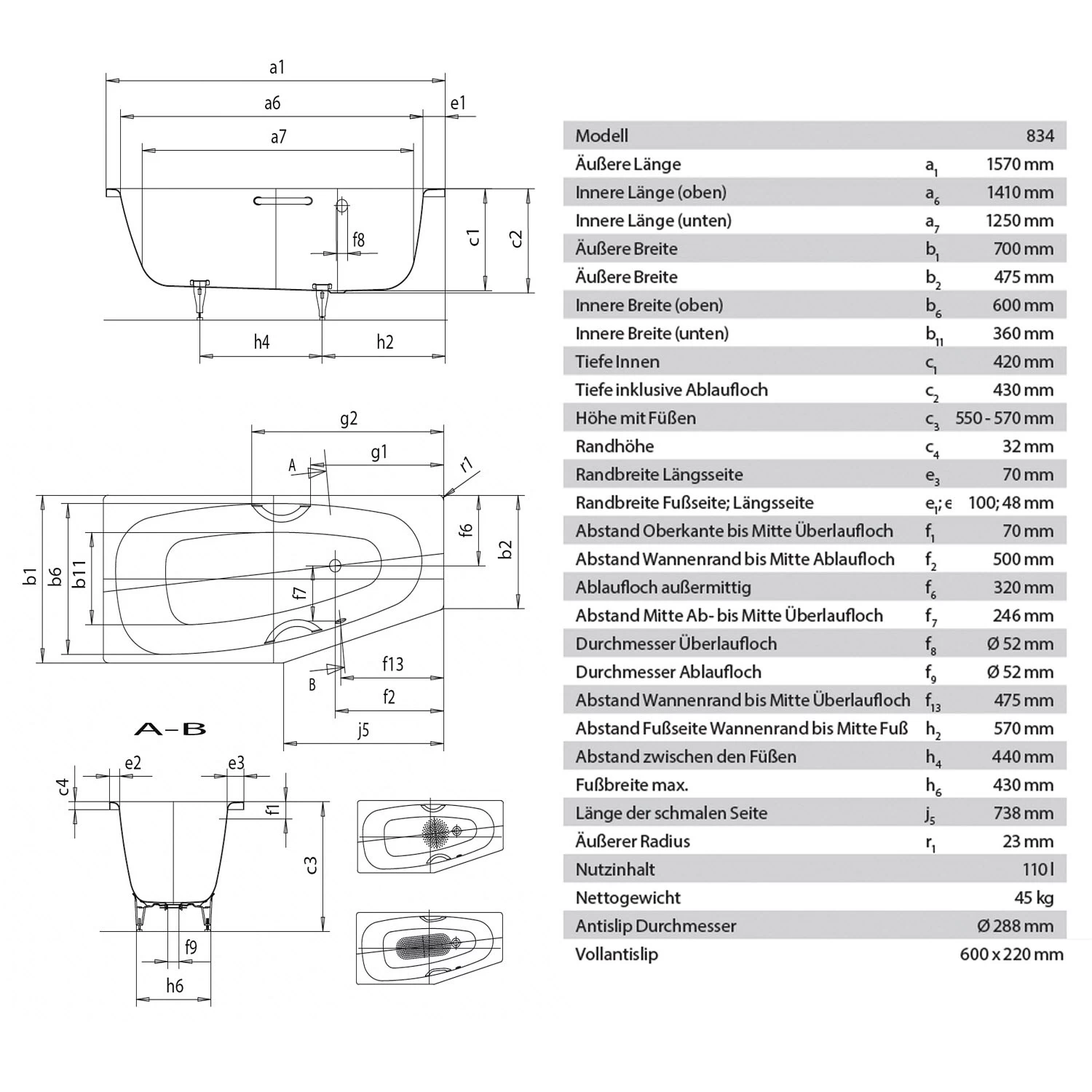 - einsitzige Wanne mit seitlich positionierten Überlauf