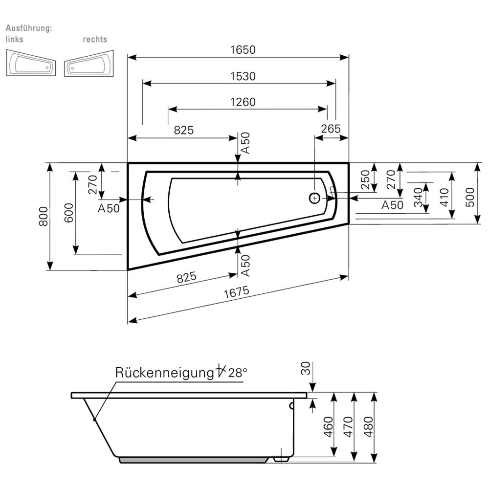 Mauersberger Raumsparbadewanne Ascea 165 rechts