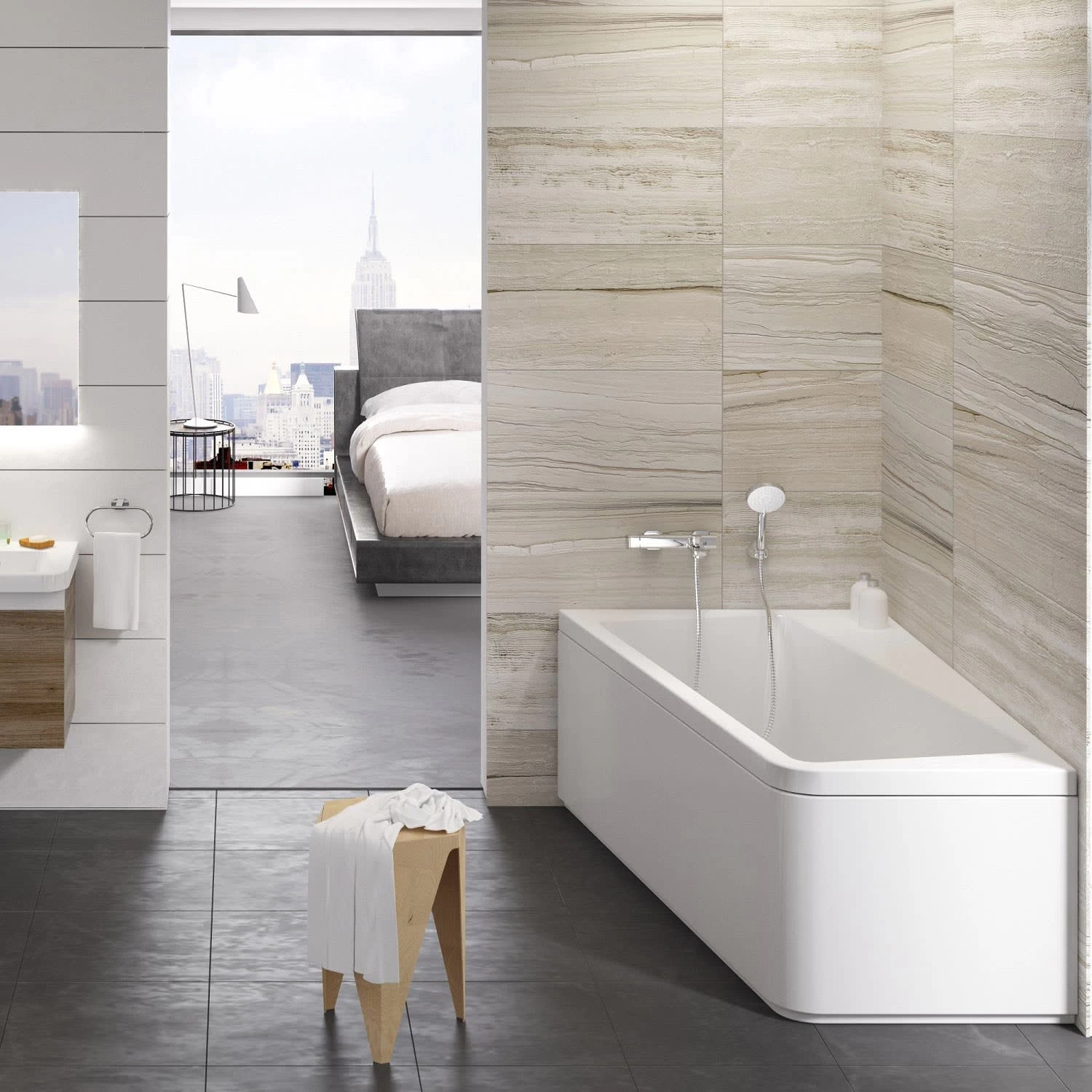 Um mehr nutzbare Fläche, etwa für Ablageflächen oder einen Duschsitz zu erhalten, reicht es, die klassische Badewannenform um gerade mal 10° zu drehen.