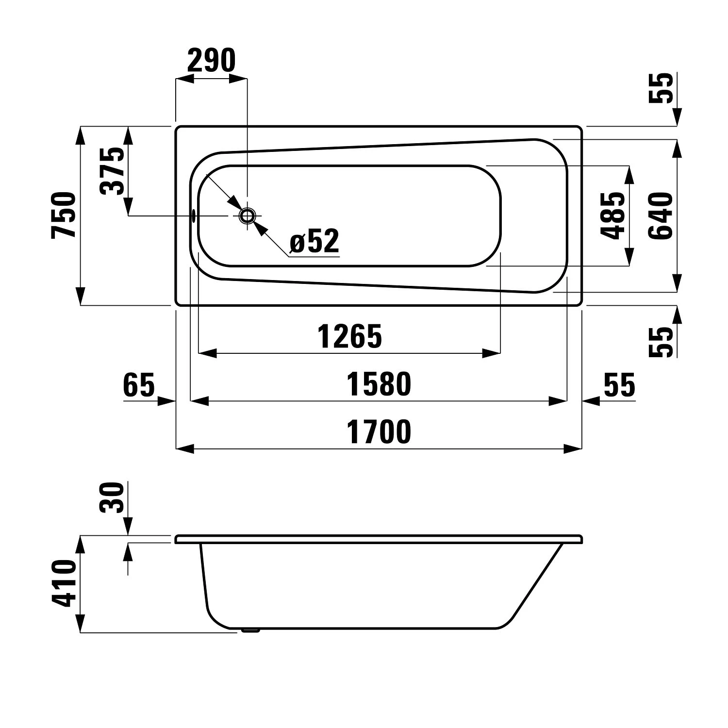 Steel Körperform-Einbaubadewanne 170 x 75 cm