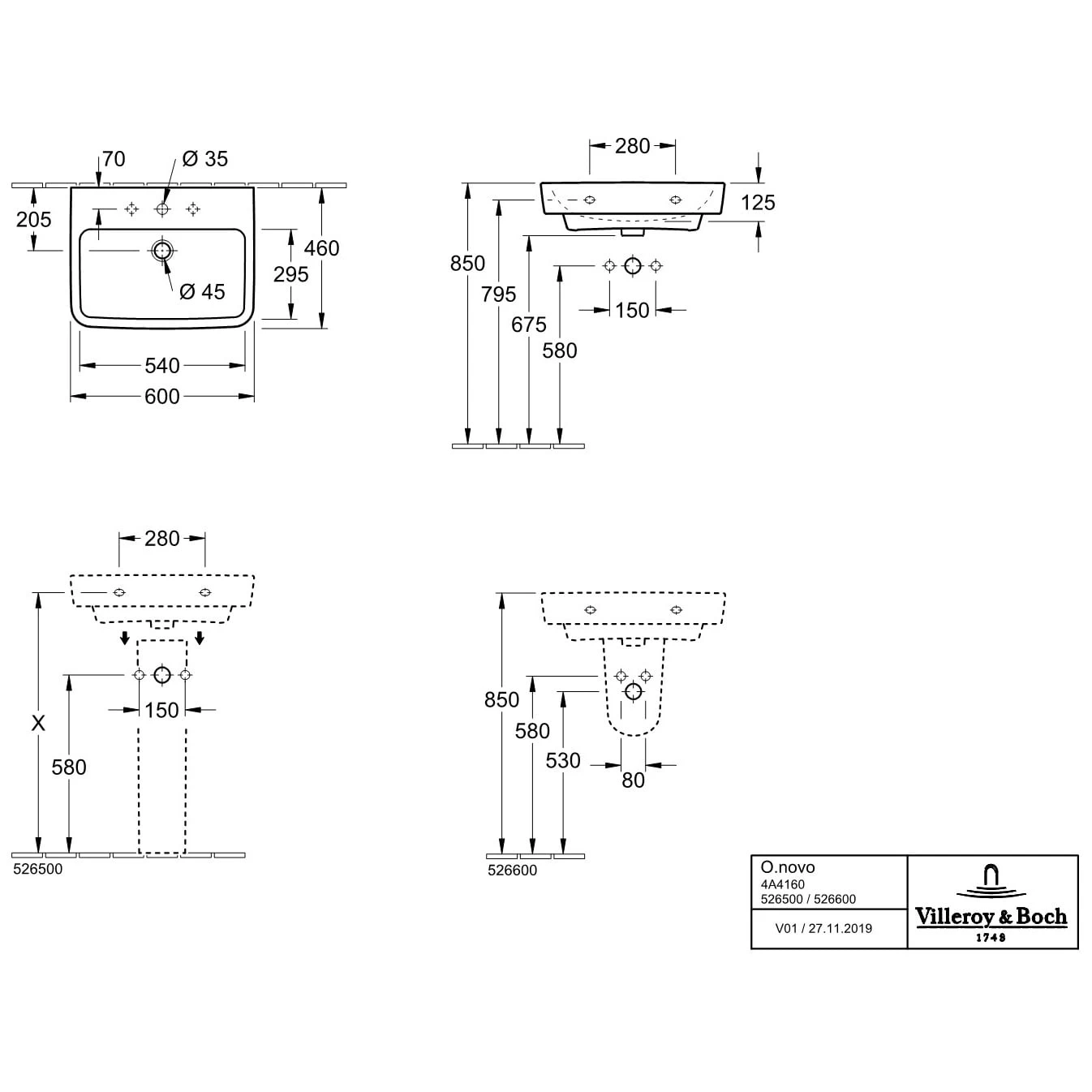 Villeroy & Boch O.novo Waschtisch 60 x 46 cm mit Überlauf, ohne Hahnloch