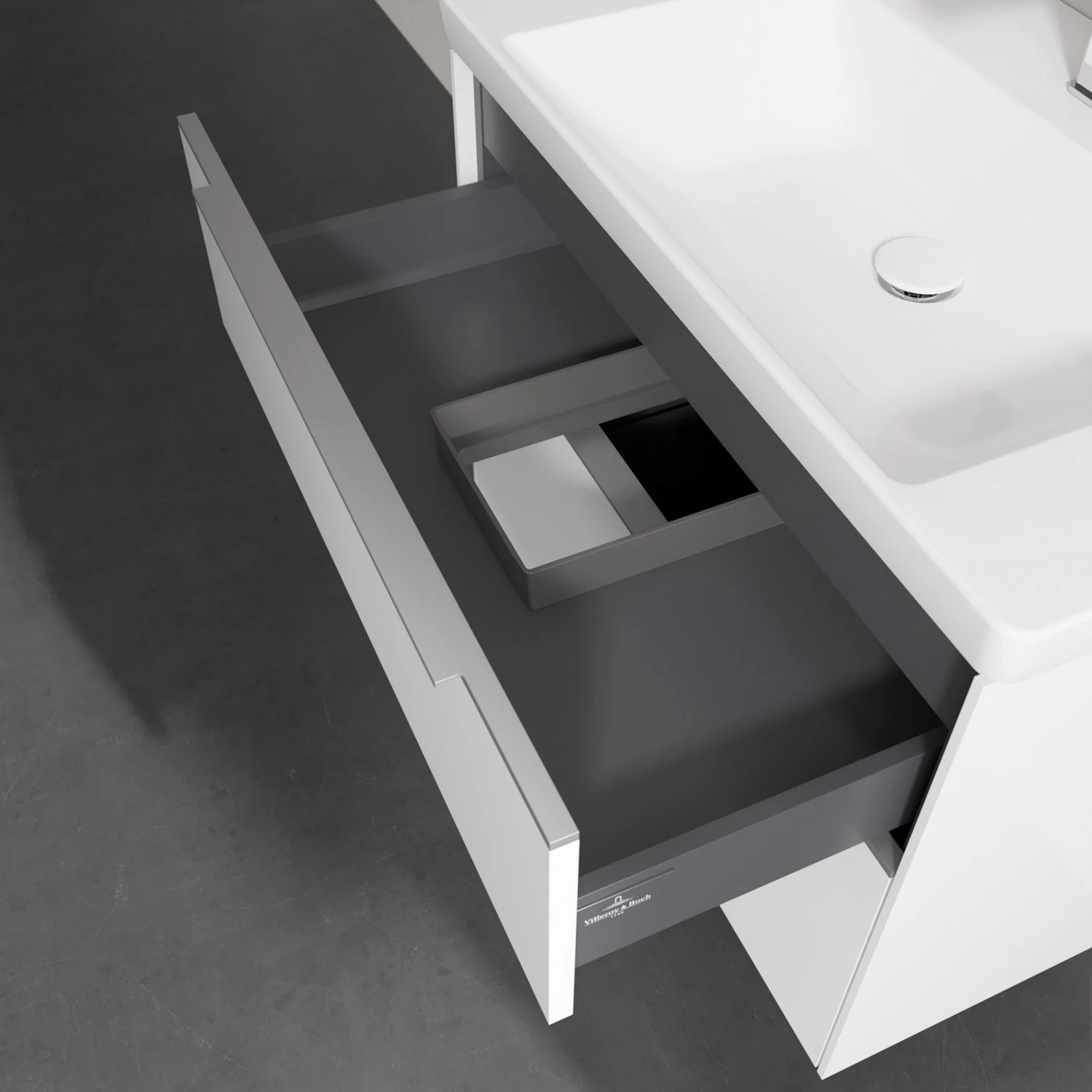 Der Waschtischunterschrank besticht durch gradliniges, zeitloses Design und großzügigen Stauraum. Eine voll ausziehbare Schublade mit rutschhemmendem Boden, Selbsteinzug-Funktion sowie zwei integrierten kleinen Accessory-Boxen bietet Platz für Pflege- und Hygieneartikel. Front und Korpus sind hochwertig verarbeitet. Die dezente Griffleiste sorgt für einfache Handhabung und bildet einen besonderen Design-Akzent.